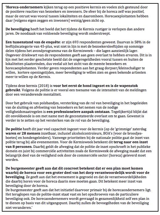 Absurde oplossing beveiligers te laten inhuren door de ondernemers . Beveiligers zijn voor de etablissementen prima maar de problematiek is in de openbare ruimte . In de donkere weggetjes en steggetjes . En niet te vergeten in de natuurgebieden tegen het dorp aanliggend .Daar liggen de prioriteiten van Politie .Reaktie van Maria Piel .