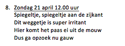 Vind jij het Gouden Ei? (8) Oog op Blaricum vragen 21 april 20199 september 2020 Delen kan hier: Share op Facebook (Opent in een nieuw venster) Facebook Delen op X (Opent in een nieuw venster) X Email a link to a friend (Opent in een nieuw venster) E-mail Afdrukken (Opent in een nieuw venster) Print Delen op WhatsApp (Opent in een nieuw venster) WhatsApp Meer Share on Threads (Opent in een nieuw venster) Threads Vind-ik-leuk Aan het laden... Gerelateerd Gepubliceerd door Oog op Blaricum Bekijk alle berichten van Oog op Blaricum Gepubliceerd 21 april 20199 september 2020