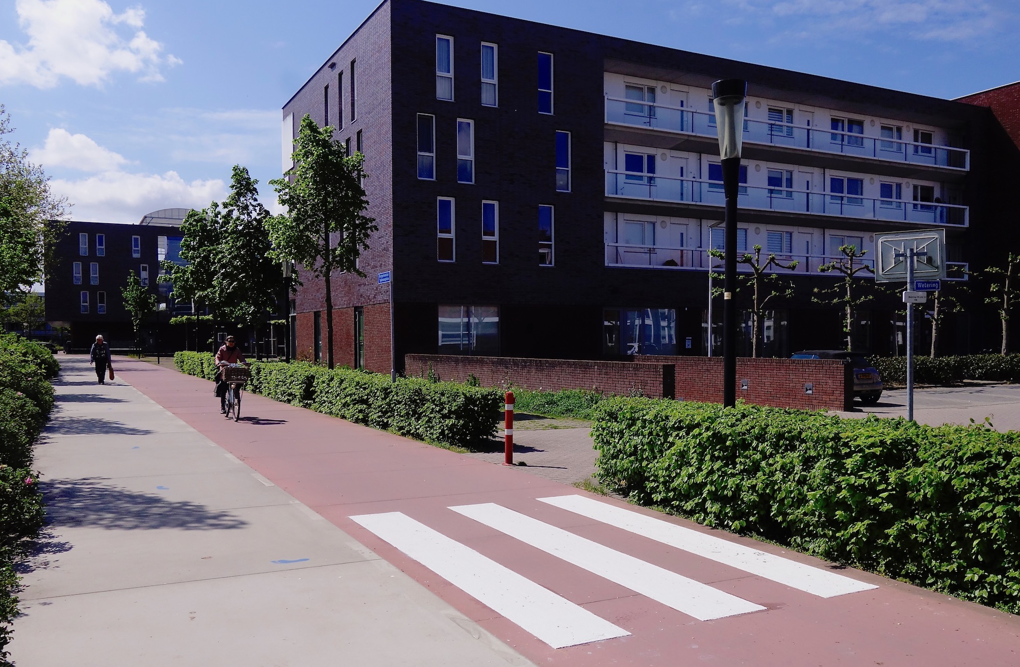 De zebra is nu ook achter de bosschage op de rijweg aangebracht. Nu alleen de bosschage nog snoeien. Als dat gebeurt, zou ik zegge, gelijk even doorlopen en de doorgangen bij de parkeervakken aan de Wetering aanpassen door ook daar de bosschage te snoeien. Moet toch niet zo moeilijk zijn.