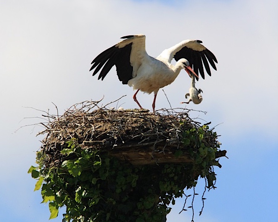 Gisterenmiddag heeft moeder ooievaar een kennelijk niet levensvatbaar kuiken uit het nest verwijderd.