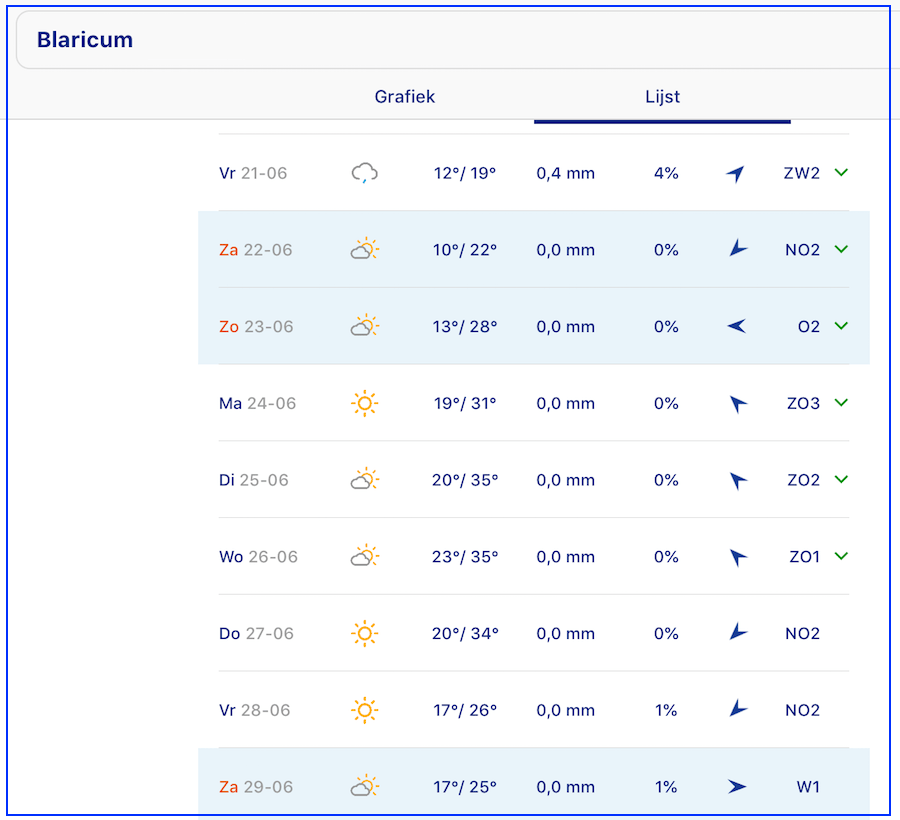Hittegolf in aantocht Oog op Blaricum nieuws, weer 20 juni 2019 Delen kan hier: Share op Facebook (Opent in een nieuw venster) Facebook Delen op X (Opent in een nieuw venster) X Email a link to a friend (Opent in een nieuw venster) E-mail Afdrukken (Opent in een nieuw venster) Print Delen op WhatsApp (Opent in een nieuw venster) WhatsApp Meer Share on Threads (Opent in een nieuw venster) Threads Vind-ik-leuk Aan het laden... Gerelateerd Gepubliceerd door Oog op Blaricum Bekijk alle berichten van Oog op Blaricum Gepubliceerd 20 juni 2019