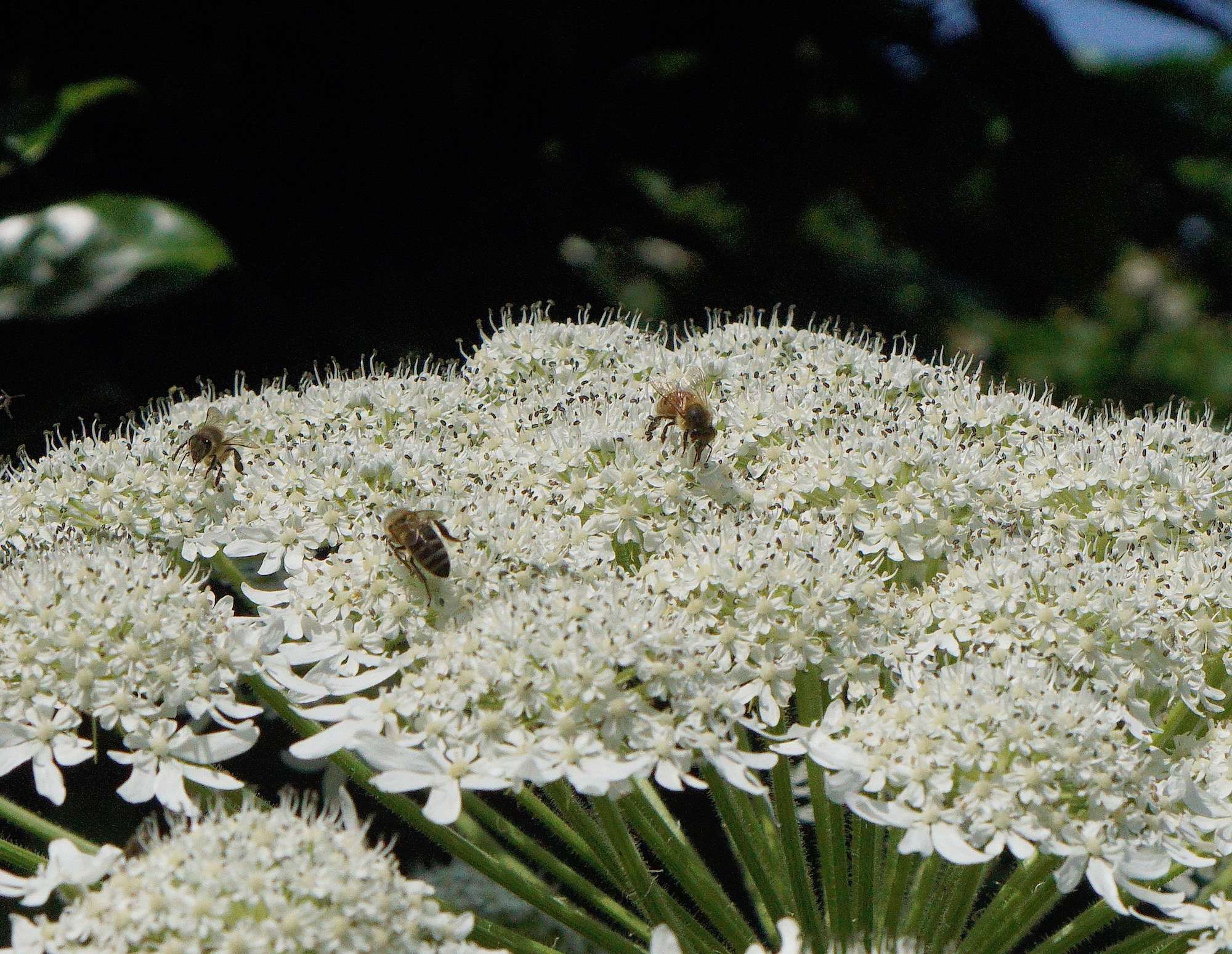 Langs het achterste gedeelte van de Capittenweg staat een rand met berenklauw. Volgens omwonenden al zo’n jaar of 50. Naar het schijnt wil de gemeente die maandag a.s. gaan verwijderen, omdat het ‘gevaarlijke exoten’ zijn. Vreemd. Ten eerste omdat het zo te zien niet om de reuzenberenklauw (exoot) gaat, maar de inheemse gewone berenklauw. Ten tweede vreemd omdat Blaricum een bij-vriendelijke gemeente wil zijn – dan is het verwijderen van deze planten juist in de periode dat ze voor bijen een glorieuze voedselbron vormen nogal onlogisch. Voorts is het verhaal dat ‘berenklauw heel erg gevaarlijk is’ onzin. Ja, je moet er niet aankomen, maar dat moet je aan een hete uitlaat en stroomdraad ook niet.