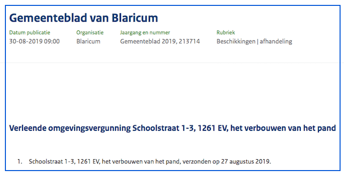 Nou, dat is vlot! Oog op Blaricum goed bezig, veranderingen 1 september 2019 Vrijdag de vergunning gepubliceerd – en zaterdag … … de boel al gestript. Delen kan hier: Share op Facebook (Opent in een nieuw venster) Facebook Delen op X (Opent in een nieuw venster) X Email a link to a friend (Opent in een nieuw venster) E-mail Afdrukken (Opent in een nieuw venster) Print Delen op WhatsApp (Opent in een nieuw venster) WhatsApp Meer Share on Threads (Opent in een nieuw venster) Threads Vind-ik-leuk Aan het laden... Gerelateerd Gepubliceerd door Oog op Blaricum Bekijk alle berichten van Oog op Blaricum Gepubliceerd 1 september 2019
