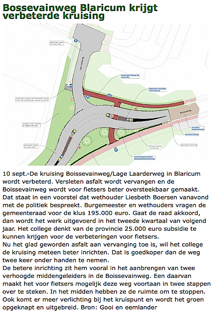 De fietsenoversteek bij de Boissevainweg/Lage Laarderweg wordt veiliger gemaakt. Met name door de aanleg van een verhoogde middengeleider.