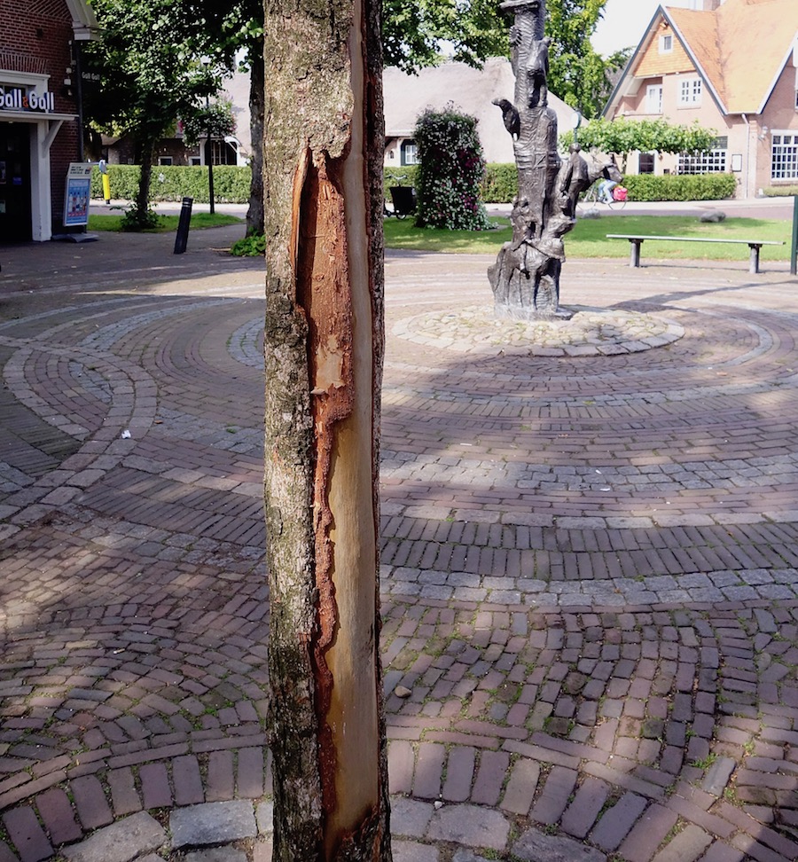 Dat levert twee vragen op. 1) Gaat er net zo streng worden gehandhaafd als op de punaises voor de Amsterdamse horeca? Eén stoelpoot over de lijn: bekeuring. 2) De beoogde standplaats betekent dat een boom(pje) voor de muziektent moet verdwijnen. Komt daarvoor een herplantplicht? En trouwens: hoe kan het zijn dat het boompje dat in maart 2019 ook qua bast nog volledig gaaf en gezond was (zie rode pijl op de eerste foto), nu een zwaar beschadigde buitenkant heeft, waardoor de boom sowieso ten dode is opgeschreven? Toevallig vandalisme of strategisch onderdeel van eh … beleid?