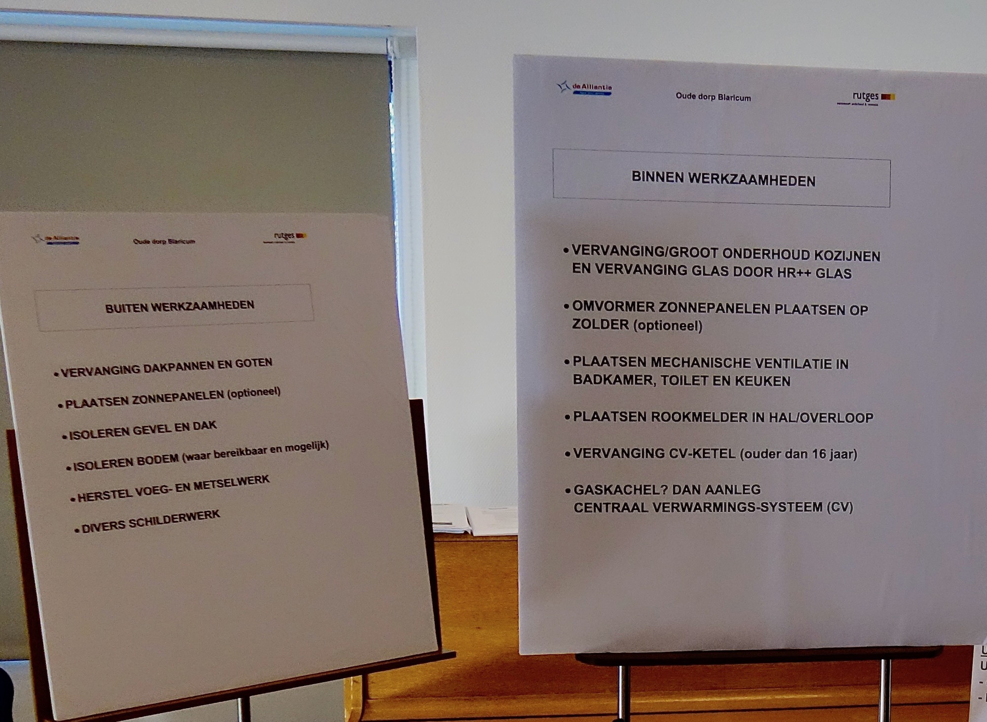 1. Er is een telefoonopname van de meest recente bijeenkomst d.d. 13 november j.l. waarin te horen is dat de Alliantie zegt dat er niet afgeweken wordt van hun voornemen om de houten en oorspronkelijke materialen te verwijderen en kunststof terug te plaatsen . No way zegt de Alliantie dat er ooit hout terugkomt . . Er bestaat nog zoiets als bezwaarschriften ,b.v. van mensen op de Statenkamer die zich aan hele strenge regels hadden te houden opgelegd door Welstand en de gemeente Blaricum nadat zij de woning gekocht hadden van de Alliantie . De woningen behoren hun karakteristieke waarde te behouden , bij het isolatieprojekt . Ik ben met een tweede persoon op het gemeentehuis in Eemnes geweest . voor de omgevingsvergunning van Ludenweg 13 waarop alle woningen zullen meeliften . De baliemedewerkster liet ons zien dat op de Statenkamer bij woningen met spouwmuurruimte minder dan 5 cm. er kunststof wanden tegen de muren geplaatst worden ,afgewerkt naar waarschijnlijkheid met verlijmde steenstrips . Reaktie van Maria Piel .