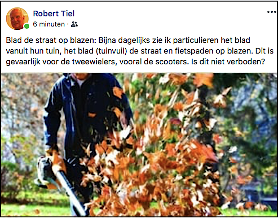 Waar nog bijkomt dat bladblazen bij uitstek de manier is om de tuin haar natuurlijke voeding te onthouden … Plus dat de geluidsoverlast onnatuurlijk schrikbarend is, zeker als er in een en dezelfde straat drie verschillende hoveniersbedrijven (de tuin zelf doen is kennelijk niet meer van deze tijd) met elk twee man aan het bladblazen zijn. Dan kan je beter ‘onder de rook’ van Schiphol wonen …
