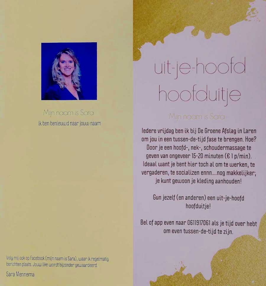 De Groene Afslag – met dorpsgenote Sara Oog op Blaricum cultuur, elders, nieuws, zaken 24 januari 2020 Website hier. En meer foto’s hier (’t is immers net Laren). Sara Mennema biedt hoofd-, nek- en schoudermassage: Delen kan hier: Share op Facebook (Opent in een nieuw venster) Facebook Delen op X (Opent in een nieuw venster) X Email a link to a friend (Opent in een nieuw venster) E-mail Afdrukken (Opent in een nieuw venster) Print Delen op WhatsApp (Opent in een nieuw venster) WhatsApp Meer Share on Threads (Opent in een nieuw venster) Threads Vind-ik-leuk Aan het laden... Gerelateerd Gepubliceerd door Oog op Blaricum Bekijk alle berichten van Oog op Blaricum Gepubliceerd 24 januari 2020