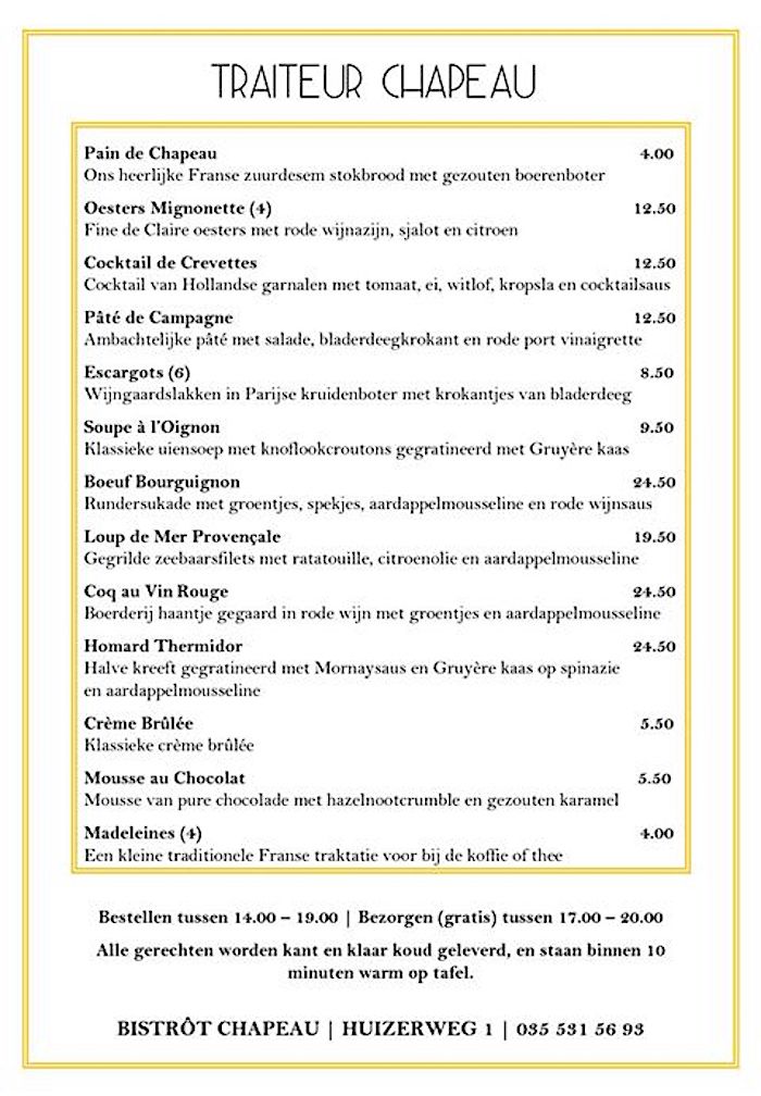 Bistrôt Chapeau wordt tijdelijk Traiteur Chapeau Oog op Blaricum nieuws, zaken 16 maart 2020 Geniet veilig van de Franse cuisine van Chapeau – maak thuis een gezellige bistrot! Delen kan hier: Share op Facebook (Opent in een nieuw venster) Facebook Delen op X (Opent in een nieuw venster) X Email a link to a friend (Opent in een nieuw venster) E-mail Afdrukken (Opent in een nieuw venster) Print Delen op WhatsApp (Opent in een nieuw venster) WhatsApp Meer Share on Threads (Opent in een nieuw venster) Threads Vind-ik-leuk Aan het laden... Gerelateerd Gepubliceerd door Oog op Blaricum Bekijk alle berichten van Oog op Blaricum Gepubliceerd 16 maart 2020