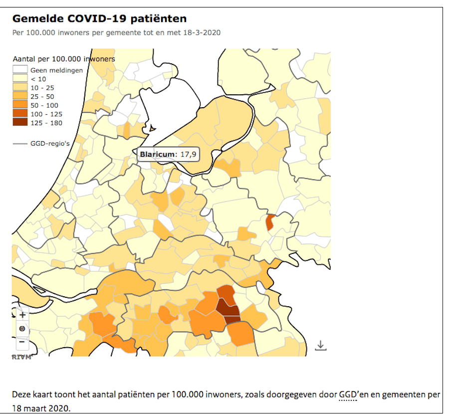 Hoi Oog, dat kijkster schrok is niet zo gek. RIVM heeft eigenlijk een onvolledige kaart gepubliceerd. Voor iets als verspreiding van ziekten is binnen de geografie (en ook in de school aardrijkskunde) gebruikelijk om een choropletenkaart (zoals van het RIVM) te combineren met een stippenkaart (het aantal gevallen met….). Geeft een nauwkeuriger beeld. De gehanteerde klassen zijn ook niet handig, vandaar de combinatie.