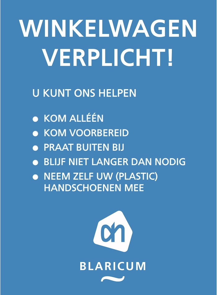– winkelwagentje verplicht – als deze allemaal in gebruik zijn, is het maximaal toegestane aantal klanten in de winkel