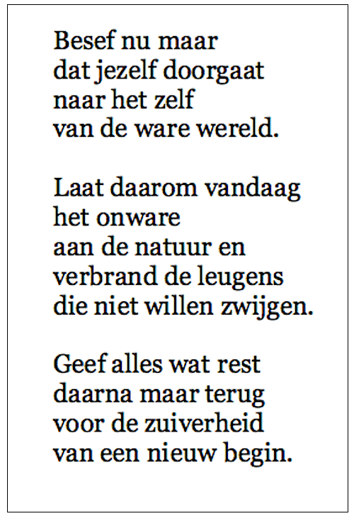 Gedicht: Geef Oog op Blaricum gedicht 25 maart 2020 Delen kan hier: Share op Facebook (Opent in een nieuw venster) Facebook Delen op X (Opent in een nieuw venster) X Email a link to a friend (Opent in een nieuw venster) E-mail Afdrukken (Opent in een nieuw venster) Print Delen op WhatsApp (Opent in een nieuw venster) WhatsApp Meer Share on Threads (Opent in een nieuw venster) Threads Vind-ik-leuk Aan het laden... Gerelateerd Gepubliceerd door Oog op Blaricum Bekijk alle berichten van Oog op Blaricum Gepubliceerd 25 maart 2020
