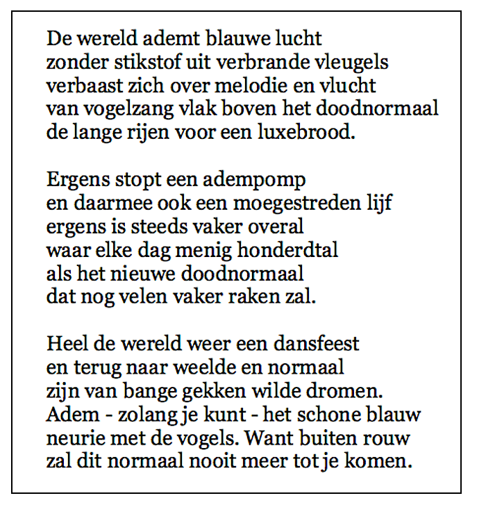 Gedicht: normaal Oog op Blaricum gedicht 19 april 2020 Delen kan hier: Share op Facebook (Opent in een nieuw venster) Facebook Delen op X (Opent in een nieuw venster) X Email a link to a friend (Opent in een nieuw venster) E-mail Afdrukken (Opent in een nieuw venster) Print Delen op WhatsApp (Opent in een nieuw venster) WhatsApp Meer Share on Threads (Opent in een nieuw venster) Threads Vind-ik-leuk Aan het laden... Gerelateerd Gepubliceerd door Oog op Blaricum Bekijk alle berichten van Oog op Blaricum Gepubliceerd 19 april 2020