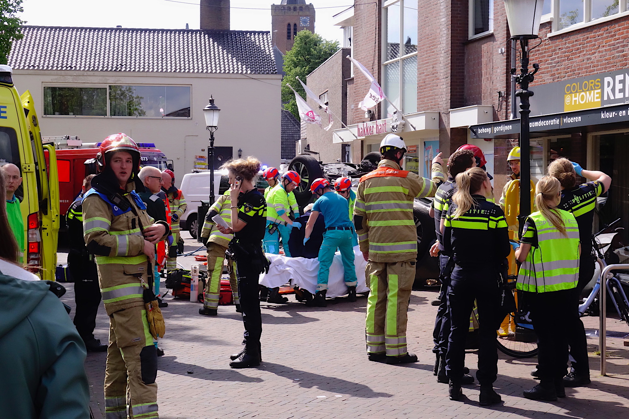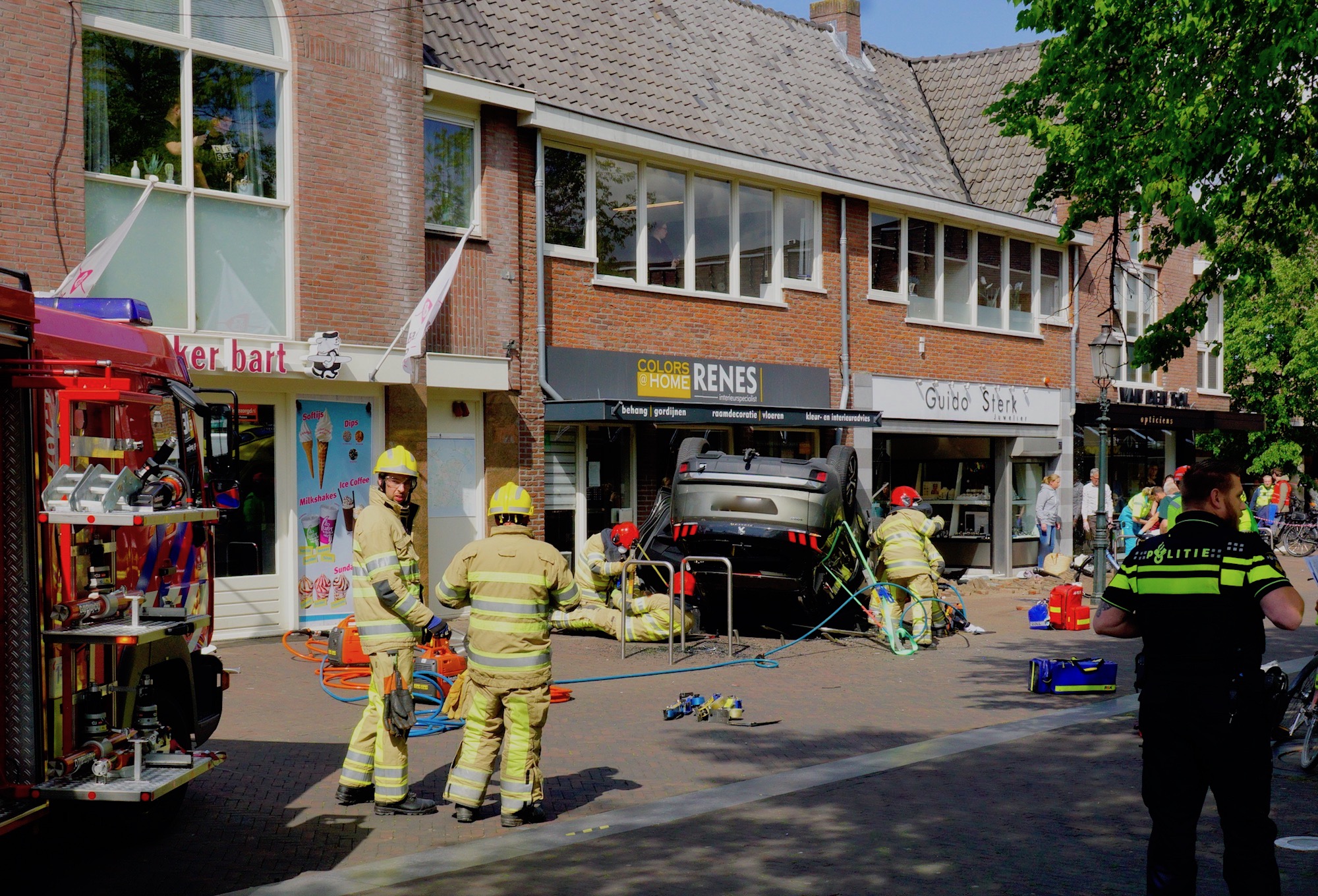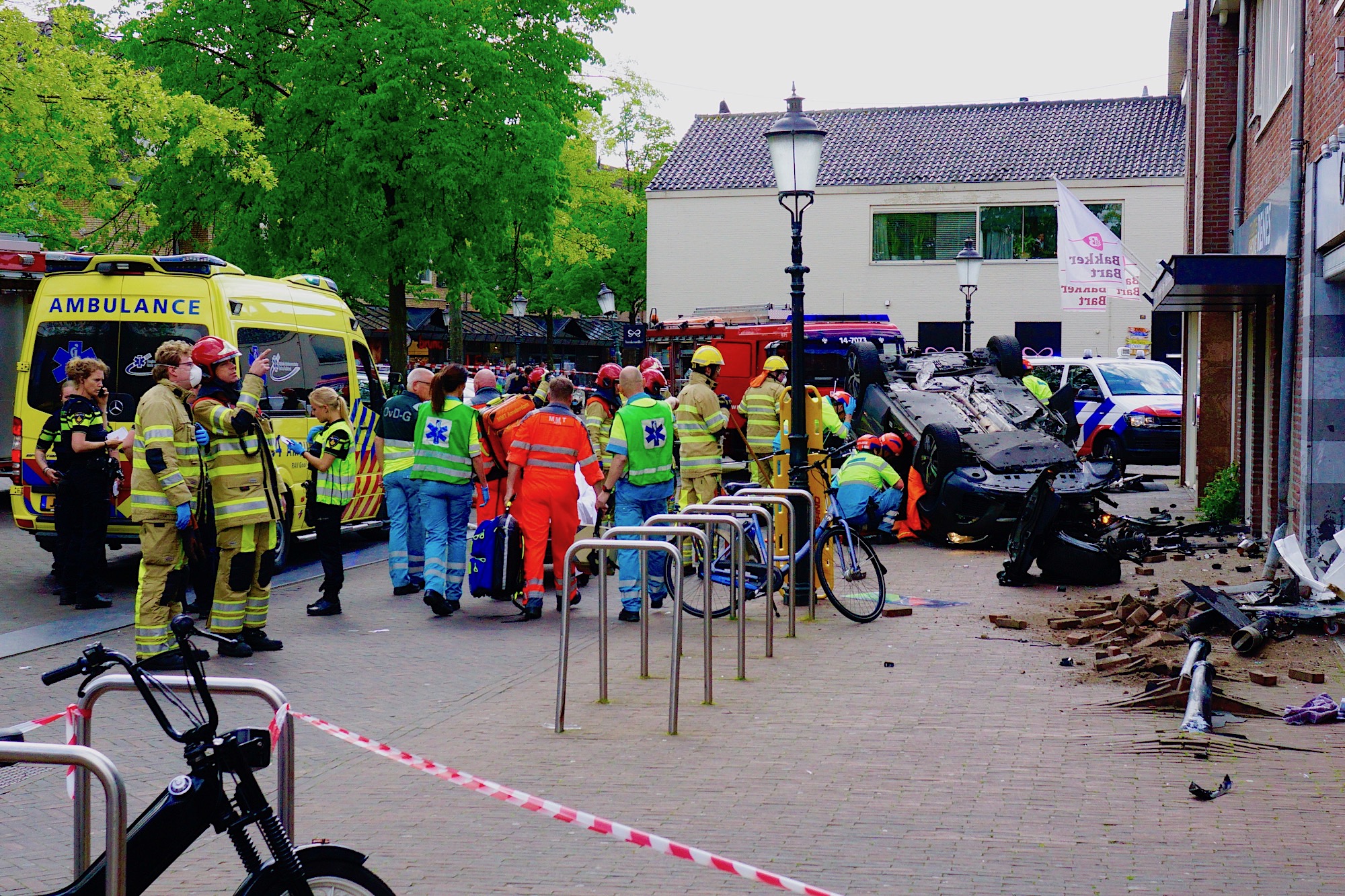 Huizen, Oude Raadhuisplein, 15:26 uur: door onbekende oorzaak reed een personenauto met hoge snelheid door de Kerkstraat. Meerdere buitengestalde fietsen van The Bike Jewelry werden platgereden, daarna reed de auto over diverse straatmeubilair en uitstalkasten en kwam op het Oude Raadhuisplein op zijn kop tegen een winkelpui tot stilstand. De bestuurder zat bekneld en is door de brandweer bevrijd. De inzet van de hulpdiensten was fors; ook de traumaheli als Brandweer Blaricum kwamen ter plaatse. Naar het zich liet aanzien vielen de verwondingen bij de bestuurder mee.