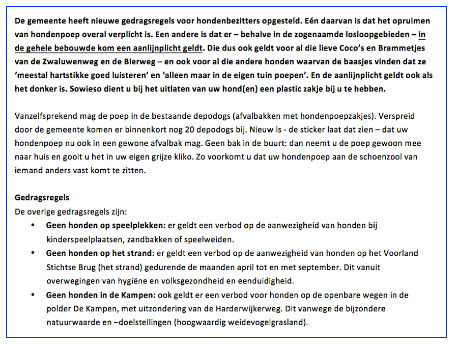 Maar het hele onderwerp hondenpoep herinnert me ook aan wat er lang geleden gebeurde vanuit een Gemeenteraad die in hoofdzaak bestond uit import (“nieuwe rijken”). In de raad kwamen toen klachten over paardenmest (paardenvijgen) op de openbare wegen in het dorp. Dáár moest iets tegen gedaan worden!!!