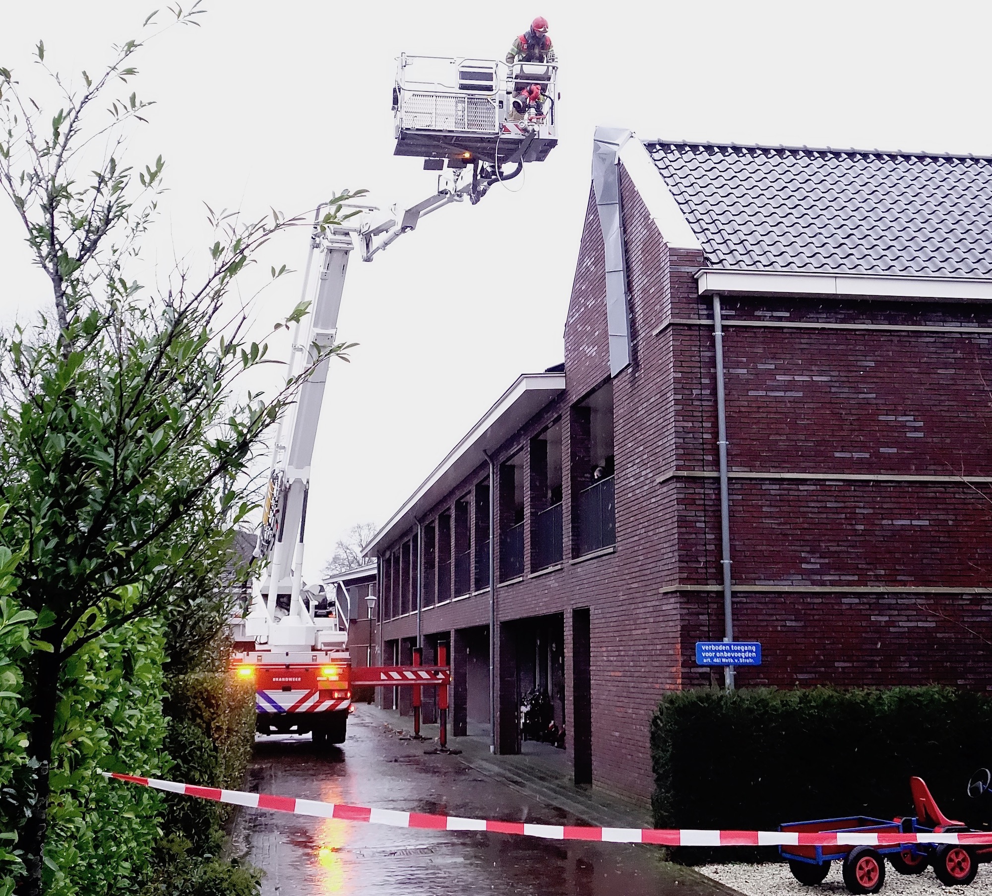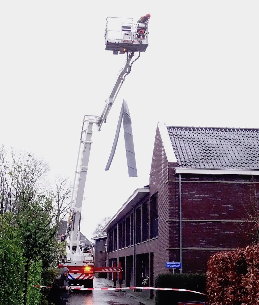 De Wingerd, 13:30 uur: de storm heeft van De Wingerd de zinken bedekking van een windveer losgetrokken. Brandweer Huizen kwam met de hoogwerker om het onderdeel te verwijderen.