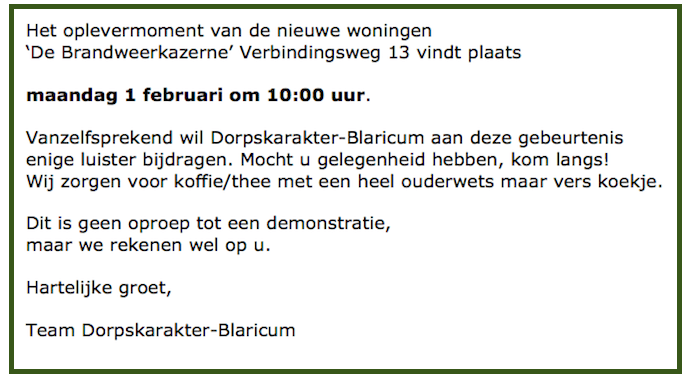Wij hebben deze oplevering bewust klein gehouden ivm Corona. Helaas maar het is niet anders. Om nu iedereen op te roepen om koffie met een koekje te komen halen past niet in deze aanpak en daar nemen wij geen enkele verantwoordelijkheid voor. Graag zie ik dat de organisatie die deze oproep doet de oproep intrekt. Ik ga graag met hen in gesprek maar niet op het moment van de oplevering voor nieuwe huurders die hier erg naar hebben uitgekeken. De oproep past ook niet in de extreme Corona situatie waarin we zitten. Normaal hadden we de lokale horeca rond deze oplevering gevraagd de catering te verzorgen en iedereen die betrokken is bij dit project uitgenodigd maar dat kunnen we helaas niet doen. Kortom deze oproep is zeer ongepast en ondoordacht, gaarne intrekken dus. Ik wens iedereen verder een prettig weekend. Maarten van Gessel, directeur bestuurder van Het Gooi en Omstreken.