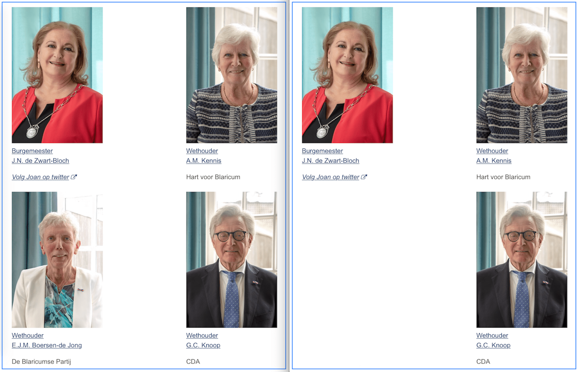 Zowat gelijk met een wethouder die te kennen gaf per direct af te treden, kwam daarover gisterenavond van de gemeente een ‘voorgekookt’ persbericht binnen. Maar 24 uur later is de site van de gemeente wat betreft de samenstelling van het college van B&W nog ongewijzigd (links). Rechts zoals die nu behoort te zijn.