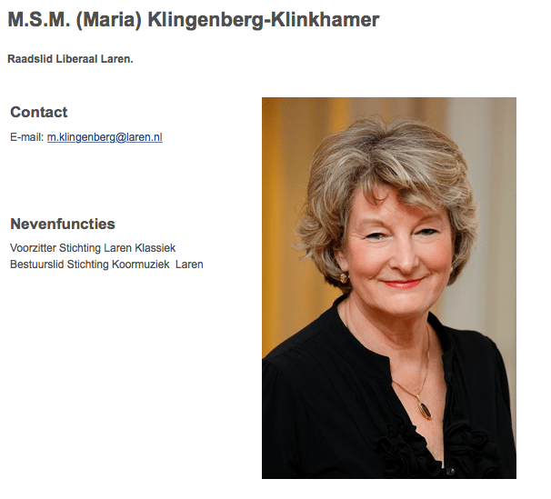 Bepaald niet onervaren in het lokale bestuur. Besloot in 2017 en na 28 jaar haar politiek/bestuurlijke schoentjes aan de leilindes te hangen – met onder andere een wethouderschap over bergen en dalen. De koers die ‘haar’ CDA voorlag, was in genoemd jaar echter niet meer de hare. Maar zeg nooit ‘nooit meer’, want in 2018 stond ze op de lijst van Liberaal Laren, én kwam terug in de gemeenteraad van Laren. Nu dus wethouder in Blaricum, waarbij ze aan collega-wethouder Kennis wellicht meer zal hebben dan een kennis – want ook die heeft veel politiek/bestuurlijke jaren in Laren in haar balboekje staan. Sterker: in 2002-2006 zat Maria Klingenberg met de huidige Blaricumse wethouder Annemarie Kennis in het Larense college van B&W.
