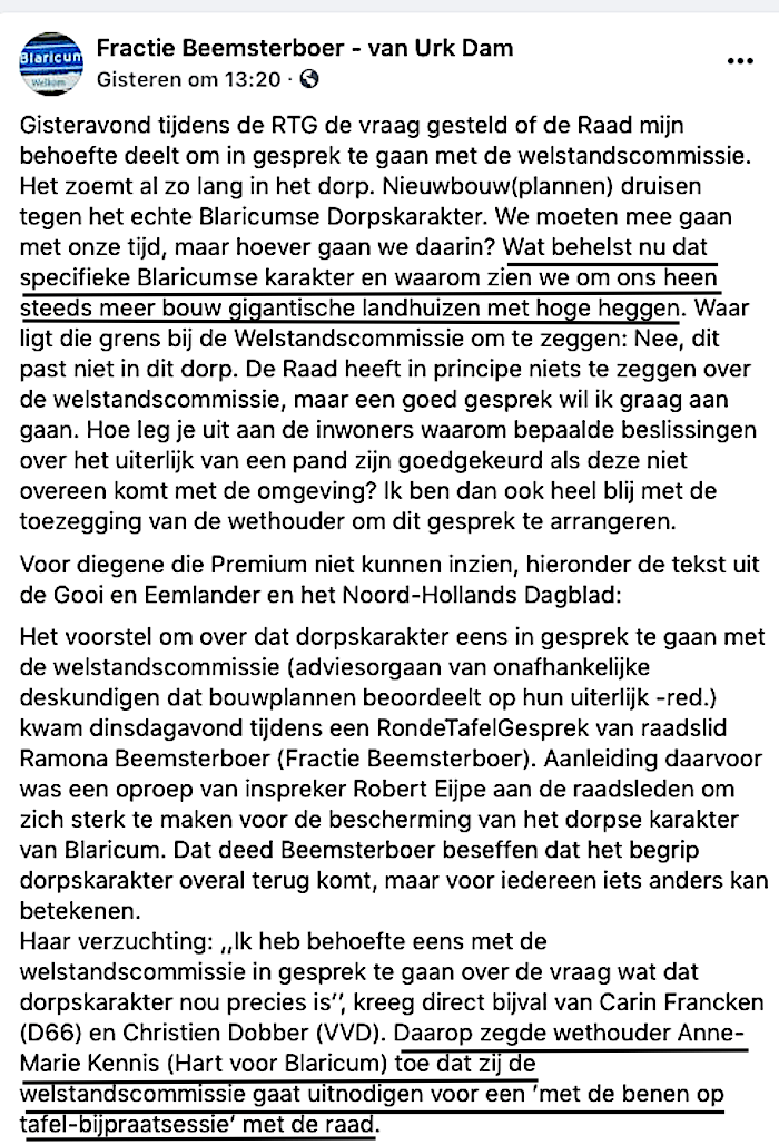 Mogelijk een rem op het steeds maar doorgaande gesloop en gekap – en het terugbouwen van woningen die niet of nauwelijks iets bijdragen aan het ‘specifieke Blaricumse karakter’.