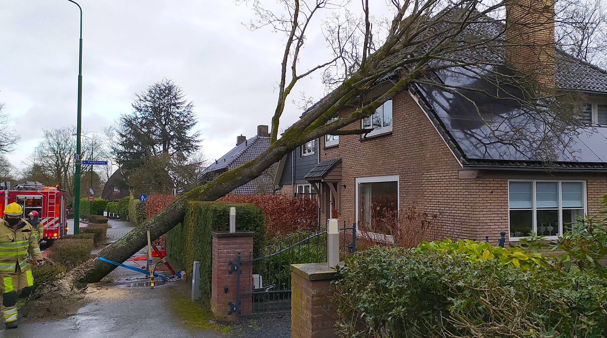 Huizerhoogt, Blaricummerstraat, 16:53 uur: een gemeenteboom is tegen een huis gevallen. Behoorlijk wat schade aan het dak. Brandweer Blaricumen Huizen hebben veilig gesteld en opgeruimd. Het verkeer is enige tijd omgeleid. Een omwonende sprak zijn ongerustheid uit over de kwaliteit van de andere bomen.