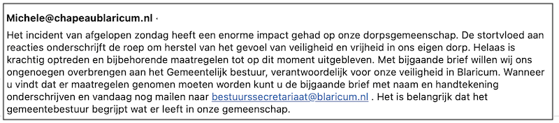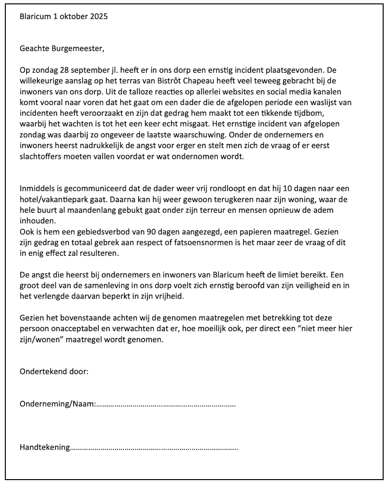 Brief Oog op Blaricum aangeleverd 2 oktober 2025 Oog publiceert deze oproep plus brief omdat ze bijdragen aan een noodzakelijk openbaar gesprek. Delen kan hier: Klik om te delen op Facebook (Opent in een nieuw venster) Facebook Klik om te delen op X (Opent in een nieuw venster) X Klik om dit te e-mailen naar een vriend (Opent in een nieuw venster) E-mail Klik om af te drukken (Opent in een nieuw venster) Print Klik om te delen op WhatsApp (Opent in een nieuw venster) WhatsApp Meer Klik om te delen op Threads (Opent in een nieuw venster) Threads Vind-ik-leuk Aan het laden... Gerelateerd Gepubliceerd door Oog op Blaricum Bekijk alle berichten van Oog op Blaricum Gepubliceerd 2 oktober 2025