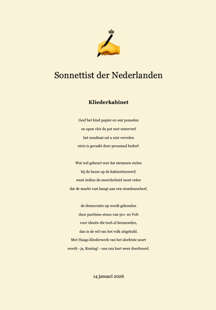 Sonnet Oog op Blaricum gedicht 16 januari 2026 Delen kan hier: Share op Facebook (Opent in een nieuw venster) Facebook Delen op X (Opent in een nieuw venster) X Email a link to a friend (Opent in een nieuw venster) E-mail Afdrukken (Opent in een nieuw venster) Print Delen op WhatsApp (Opent in een nieuw venster) WhatsApp Meer Share on Threads (Opent in een nieuw venster) Threads Vind-ik-leuk Aan het laden... Gerelateerd Gepubliceerd door Oog op Blaricum Bekijk alle berichten van Oog op Blaricum Gepubliceerd 16 januari 2026