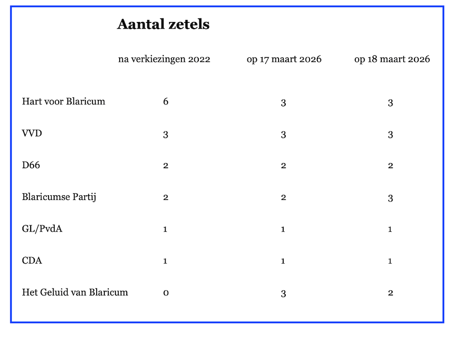 Uitslag gemeenteraadsverkiezingen Blaricum Oog op Blaricum nieuws, politiek, samenleving 18 maart 2026 Delen kan hier: Share op Facebook (Opent in een nieuw venster) Facebook Delen op X (Opent in een nieuw venster) X E-mail een link naar een vriend (Opent in een nieuw venster) E-mail Afdrukken (Opent in een nieuw venster) Print Delen op WhatsApp (Opent in een nieuw venster) WhatsApp Meer Delen op Threads (Opent in een nieuw venster) Threads Vind-ik-leuk Aan het laden... Gerelateerd Gepubliceerd door Oog op Blaricum Bekijk alle berichten van Oog op Blaricum Gepubliceerd 18 maart 2026