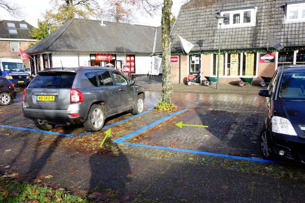 Medewerkers van het blauwverf-bedrijf vertelden zojuist dat de gemeente zou hebben besloten alleen de kopse kanten van de parkeerplaatsen met blauwe verf te vervuilen. Daar waar de groene pijlen staan, zal de blauwe verf weer worden verwijderd! Hoe heuglijk.