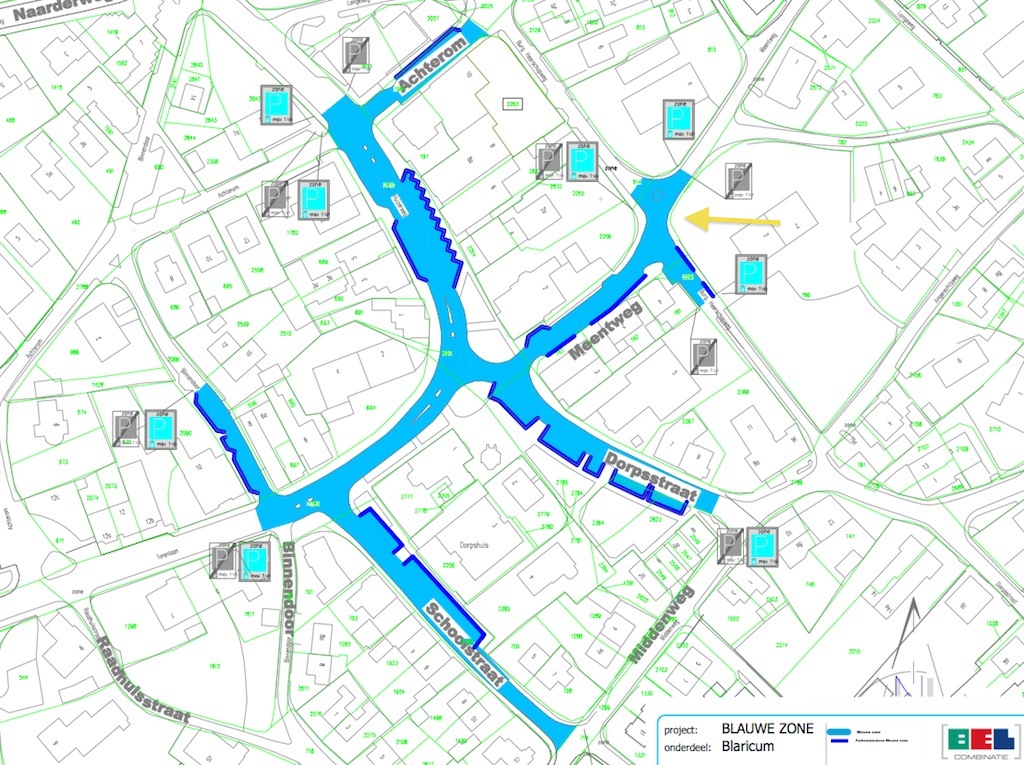 Bij het gepubliceerde besluit zat ook een tekening – maar niet onderstaande. Op die tekening waren zowel de inritten van de Blaercom als die van Dick Beek en Vishandel Blaricum aan de Meentweg als ook de eigen parkeerplaats van Kapper Töpfel aan de Burg. Heerschopweg ingetekend als blauwe zone-parkeerplaatsen. Begin augustus is er een nieuwe tekening gekomen (onderstaande). Maar geen nieuwe publicatie in de Staatscourant … Het lijkt erop dat de gemeente hiermee een procedurele fout heeft gemaakt en dat het publicatie- en beroepstraject overnieuw moet.