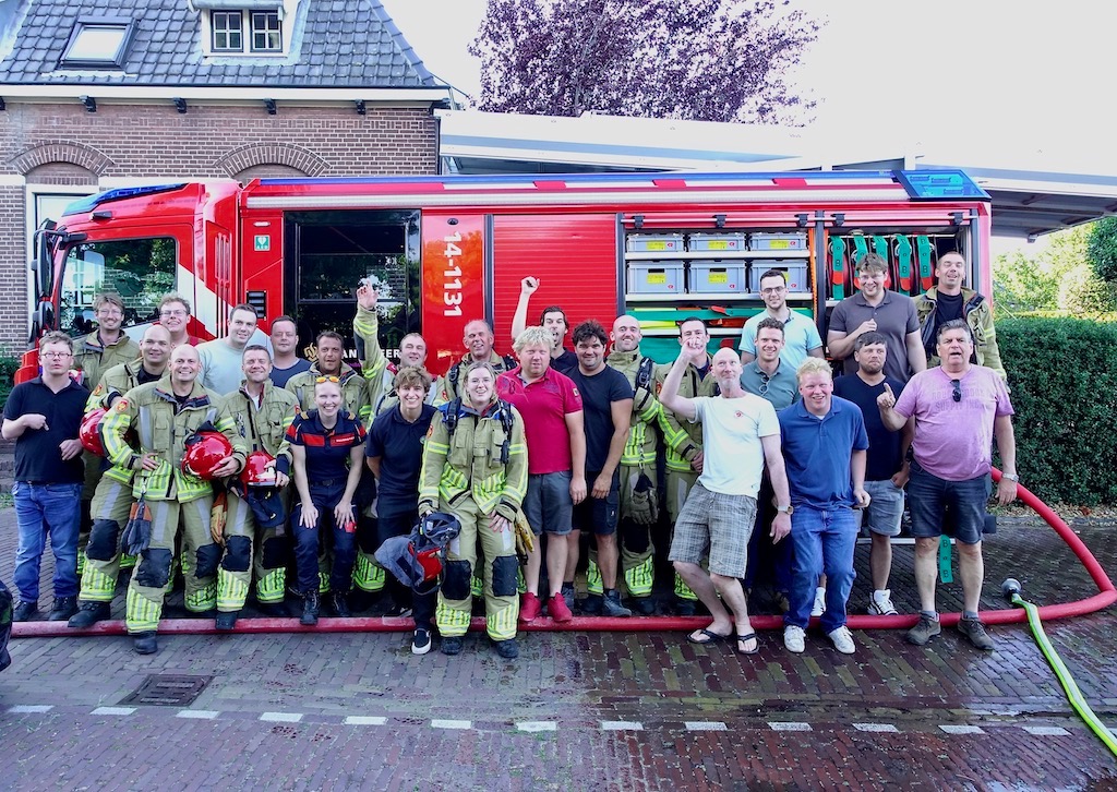 Gisterenavond werd brandweerman Hendrik-Jan van den Bergh van Brandweer Blaricum ‘getrakteerd’ op een nepalarm in zijn eigen bedrijf. Hij moest daarbij een persoon redden – dat bleek zijn vrouw te zijn … Een en ander vormde het afscheid van Hendrik-Jan, want hij stopt er na ruim 15 jaar mee, de helm kon af. Natuurlijk werd hij vrolijk en vochtig door zijn collega’s ‘uitgespoten’ en daarna ‘een bakkie’ op de post. HaJee: veel dank!
