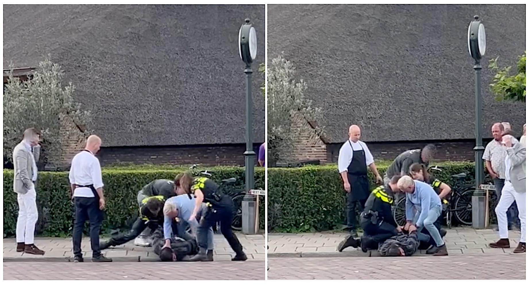 ••• ->>> De geweldpleger is van het terras afgelopen en wordt door de eerste omstander (die bij Bruno op het terras zat) aangesproken. Enkele seconden later komt er een tweede omstander bij en wordt de man naar de grond gewerkt en onder bedwang gehouden.