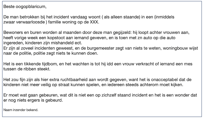 - Van veel kanten wordt Oog gevraagd een foto van de verdachte te publiceren. Die is beschikbaar, maar vooralsnog wordt dat niet gedaan. Als het algemeen belang daarom vraagt, zal dat (al dan niet geblokt) wel gebeuren.