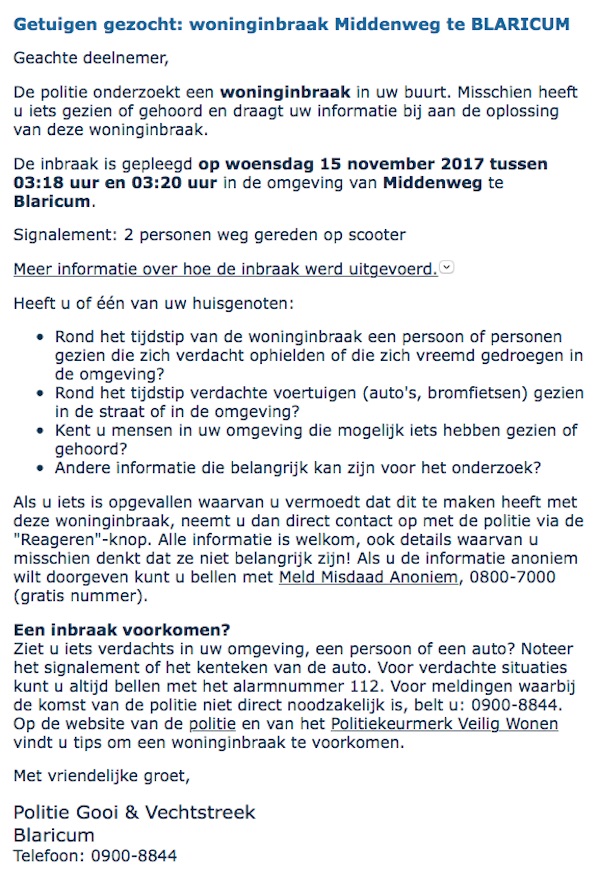 Middenweg, nacht van dinsdag op woensdag, 03:18 uur: twee personen op een scooter kregen het in twee pogingen voor elkaar met een steen van ruim 10 kilo een dubbelglas-raam te doorbreken en de daar achter staande computer (iMac, 27 inch) mee te nemen.