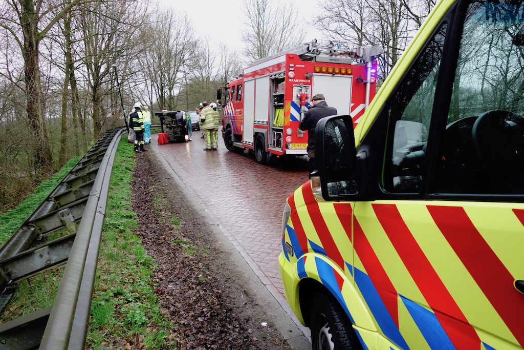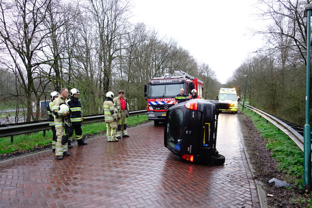 Stachouwerweg, net in Eemnes, 15:00 uur: een dame in een Suzuki, komende vanuit Blaricum, reed waarschijnlijk door een combinatie van gladheid en snelheid de bocht uit, tegen een lantaarnpaal en tegen de vangrail. Daardoor stuiterde haar auto terug en kwam op zijn kant terecht. De bestuurster had lichte (glas)verwondingen en is in de ambulance behandeld.