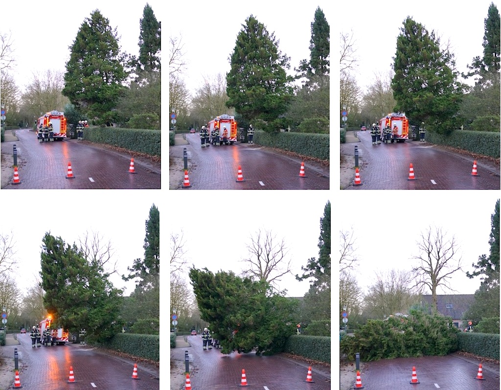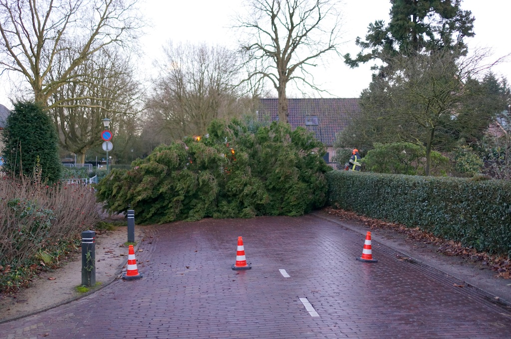 16:20 uur, Verbindingsweg 10: een conifeer (geplant in 1952) was door de wind (en ziekte/ouderdom) scheef komen te staan, een noodkap was noodzakelijk. Gelukkig kon de brandweer (nog) met zes man komen, zodat de dreiging en het oponthoud voor passanten slechts van korte duur was. De restante liggen op het schoolplein en kunnen door de organisatie van het Midwintervuur (zondag 17 uur) worden opgehaald.