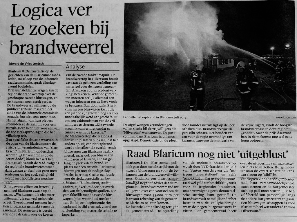 In hei&wei nr. 437 staat op pagina 3 van het gemeentedeel een bericht van Brandweer Gooi en Vechtstreek (zie hieronder). Voorzien van de eigen steunkleur en buiten de competentie van de redactie probeert regiocommandant John van der Zwan niet alleen ‘de brandweer van morgen in Blaricum’ te verkopen, maar ook de uitname van de 2e TAS te rechtvaardigen.