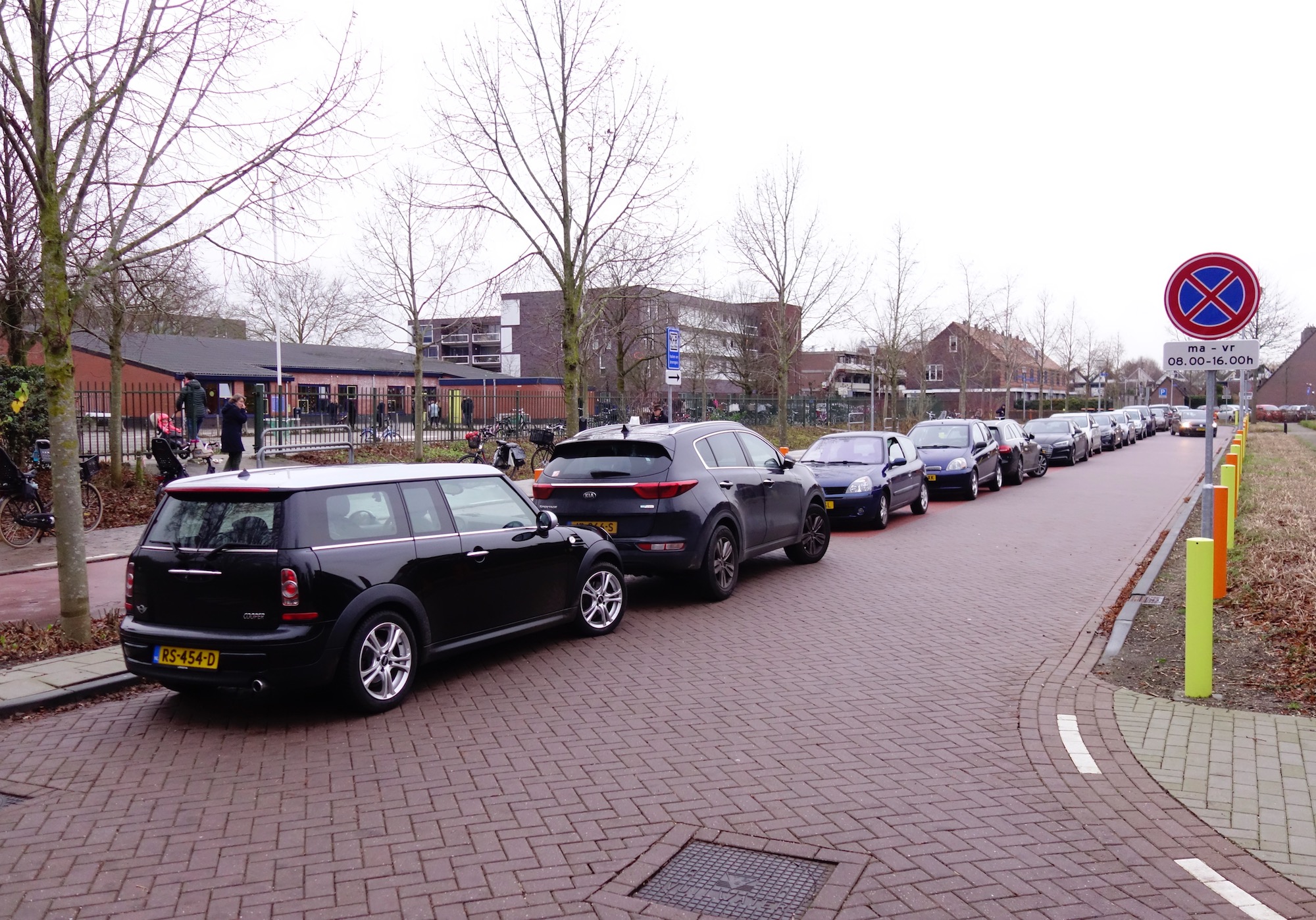 Ter illustratie twee foto’s van het parkeren bij de school … in de Bijvanck. Ja beste kijker, ook daar – wat dacht u?! Ook daar even snel de auto neergezet op/voor een rollatorvoorziening, even snel een paar goed geparkeerde auto’s geblokkeerd en ook daar iets langer dan even lekker parkeren op de duurbetaalde Kiss and Ride-strook. De prangende vraag blijft natuurlijk: ‘Wíe gaat dan direct die bekeuringen uitdelen?’