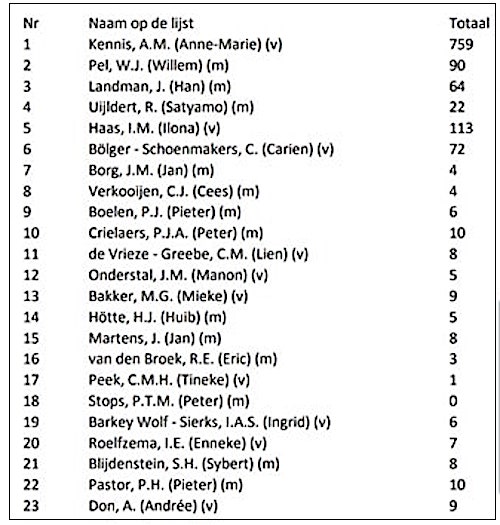 Nummer 1 is wethouder, nrs. 2 t/m 4 raadslid, nummer 5 stapt dus op. Nummer 6 was vele jaren raadslid, is erelid en nu ook partijvoorzitter en heeft wellicht niet zoveel zin in wederom een Heintje Davids-status. Nummer 7, 8 en 10 zijn (old-)bestuursleden die het niet zullen doen, nummer 9 evenmin. En de rest? Tja …