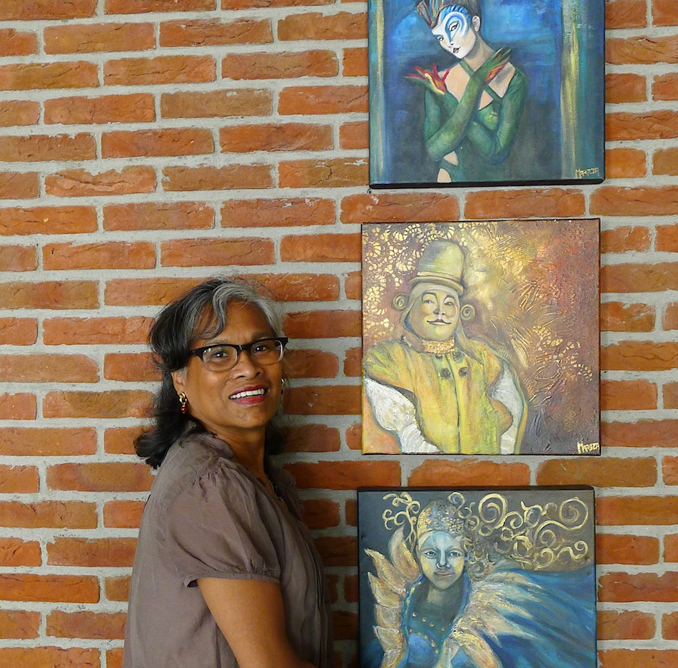 Mareza Egbers, doorgaans partner van Haarmode Leo & Mareza, hangt nu met acrylschilderijen in het Blaercom-gebouw.