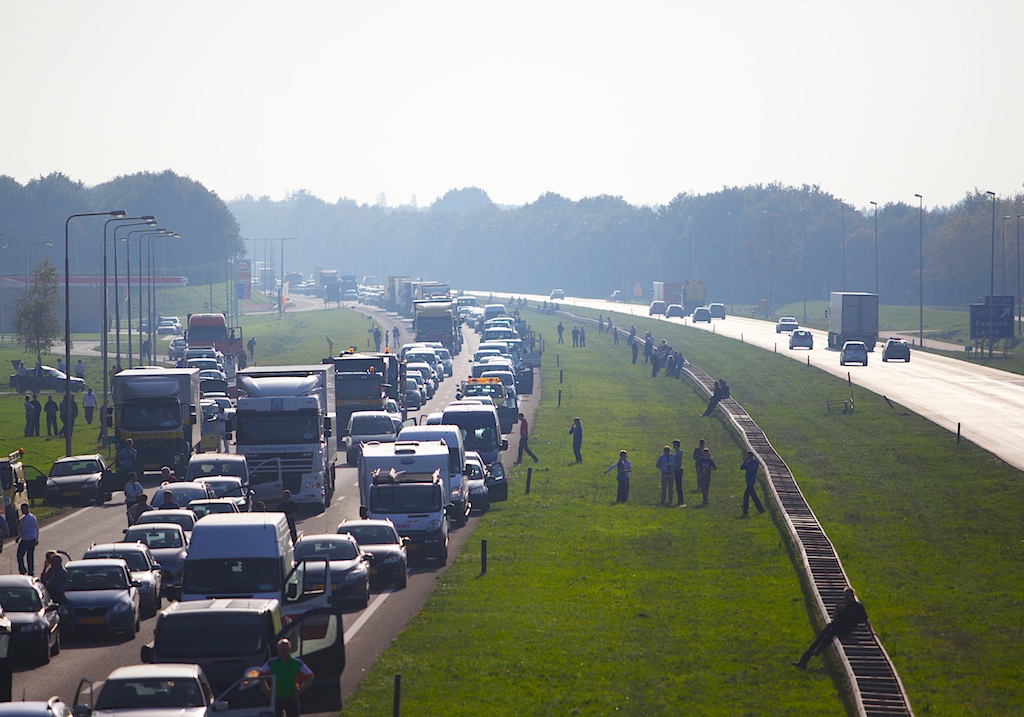 Rond half drie vond er op de A27 – precies onder de overgang van de Stachouwerweg – een stevige aanrijding plaats. Een vrachtwagen (oplegger met container van Yang Ming) reed met behoorlijke hoge snelheid achterop een stilstaande/langzaam rijdende file. Daarbij werden drie auto’s geraakt. Twee of drie (zwaar-)gewonden zijn naar ziekenhuizen afgevoerd. De Dierenambulance heeft zich over een niet-gewonde hond ontfermd. De A27 is vanaf knooppunt Eemnes richting Almere voorlopig afgesloten. Het wegslepen van de wrakken zal nog wel enige tijd duren.