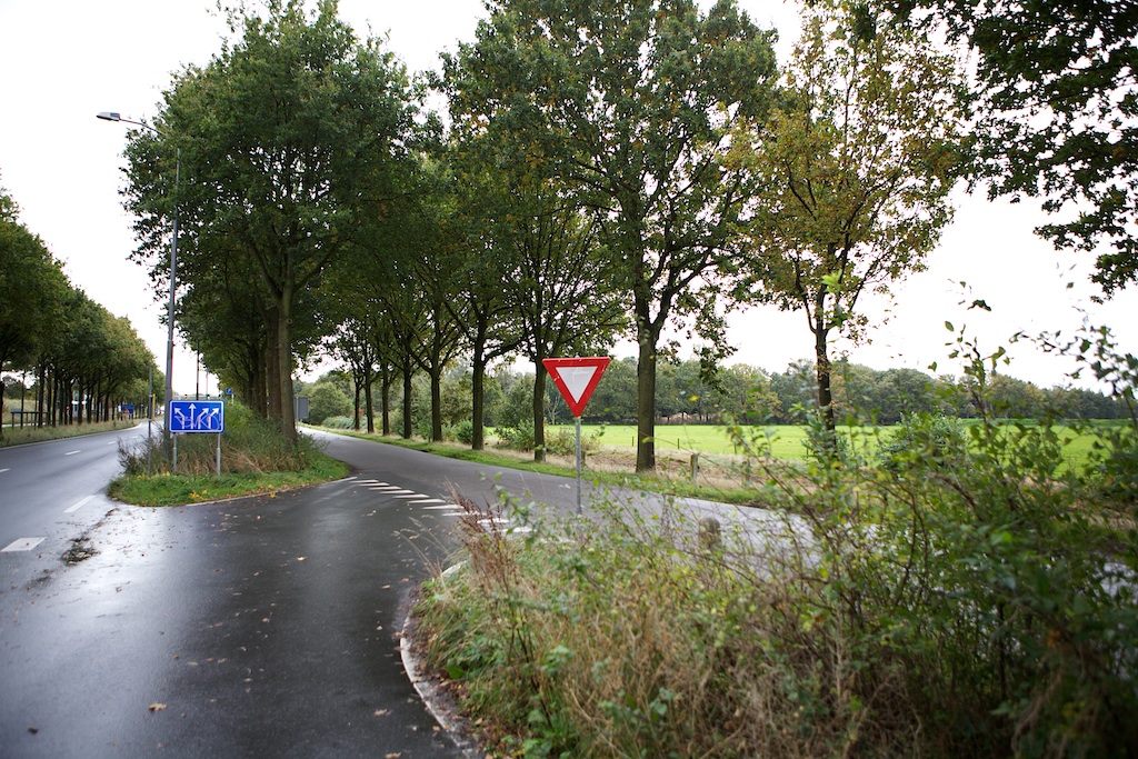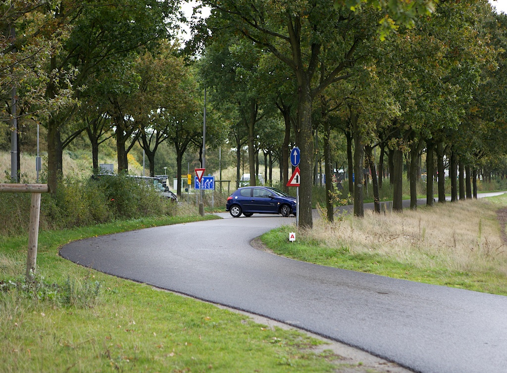 De auto die op de eerste foto van de Randweg-Oost rechtsaf slaat de Blaricummerweg op, maakt een overtreding – afslaan is daar verboden. De meesten weten dat wel en rijden via de Randweg-West en het Huizerhoogt van Huizen of de Bijvanck naar Blaricum. Enkelen echter rijden even door over de Randweg-Oost, nemen dan de afslag (tweede foto) naar de Gooyerweg (richting de Theetuin Eemnes) en maken daar een hairpin-bocht (derde foto). Dat leidt op zowel die Gooyerweg als op de Randweg tot gevaarlijke situaties. Daarom is mááááánden geleden besloten om bij het bord ‘U nadert een voorrangsweg’ (tweede foto) een bord te plaatsen dat zegt ‘Verboden hier rechtsaf te slaan.’ Wanneer gaat dat bord komen?