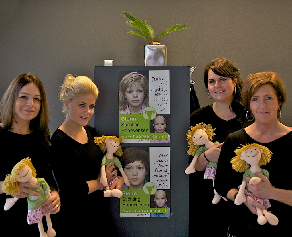 Stichting Haarwensen is er voor kinderen tot en met 18 jaar, die door medische behandelingen of een andere vorm van alopecia (kaalhoofdigheid) in aanmerking komen voor een haarwerk of pruik. Haarstudio5 (Bijvanck) doet mee met de actie Haarwensen. Als u de pop Saartje koopt voor 7,95, draagt u bij aan de Stichting Haarwensen.