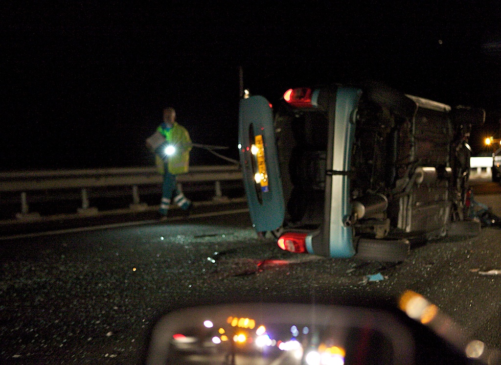 21:16 uur: eenzijdig ongeval op de A27 bij hectopaal 107,9 (midden op de Stichtse Brug): lichte beknelling, dikke file, na klap tegen de vangrail ging de auto op zijn kant, toedracht onbekend, mogelijk defect aan rechterachterwiel. De bestuurder is in de ambu behandeld; een hond die zich los in de auto bevond heeft het ongeval niet overleefd. (Eerste foto genomen uit stilstand, tweede ook …)