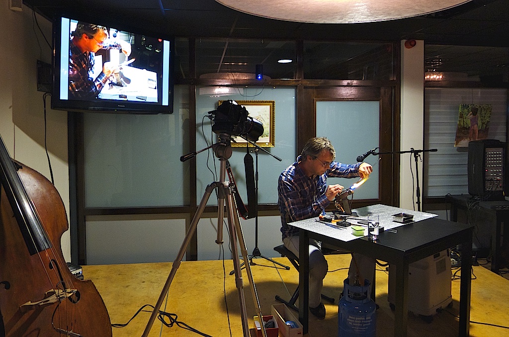Glazenier Jasper van Dien bezig in de Blaercom tijdens het Kunstcafé met het maken van een glashanger.