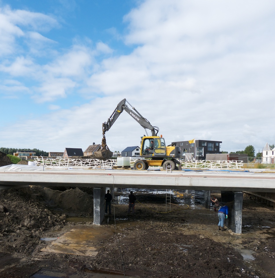 Meent: bouw van de drievoudige brug over de ooit te graven ‘rivier’. Die zal uitmonden in het Gooimeer bij de reeds voltooide sluis, die op 19 september door de burgemeester en dijkgraaf J. de Bondt van het waterschap Amstel, Gooi en Vecht officieel zal worden geopend.
