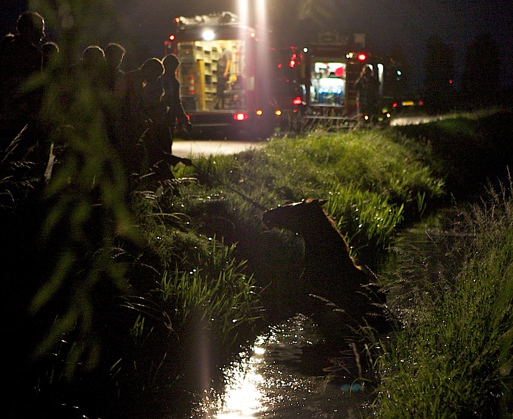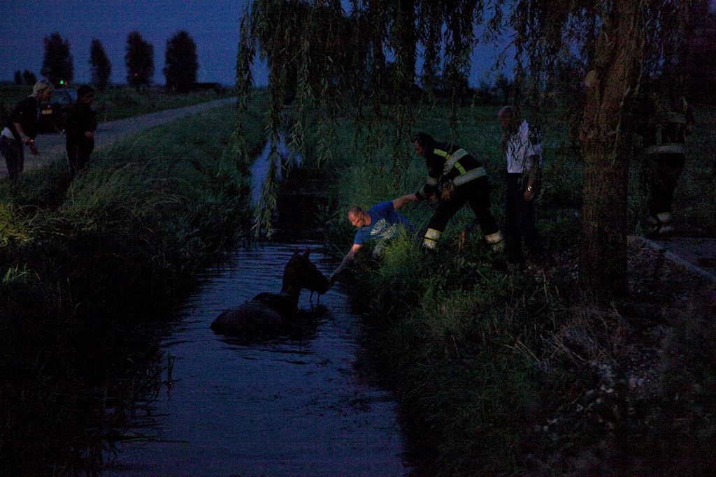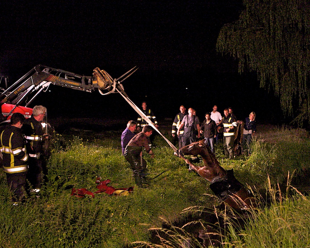 Melding 20:18 uur: in sloot aan de Hardewijkerweg (in De Kampen, andere kant A27). Na enkele pogingen stond het dier rond 21:10 uur weer op zijn hoeven, dankzij Brandweer Blaricum, Klaas Vos en Nico de Jong met zijn trekker. Ook de ruiter is in orde.