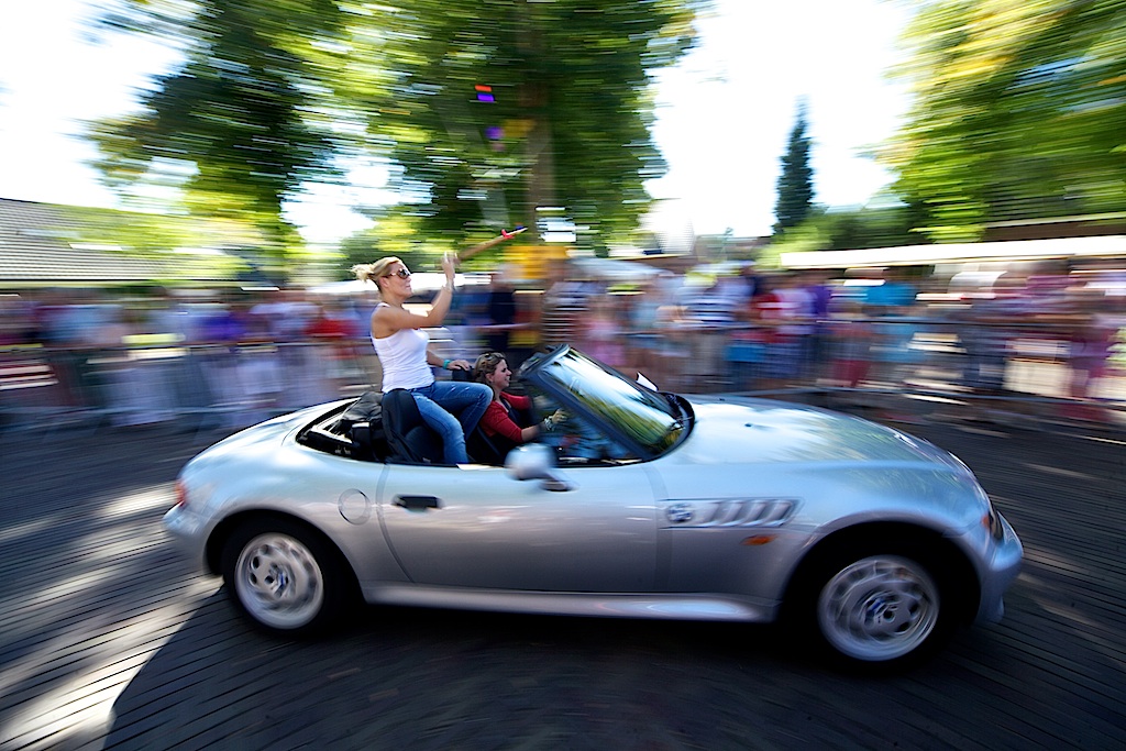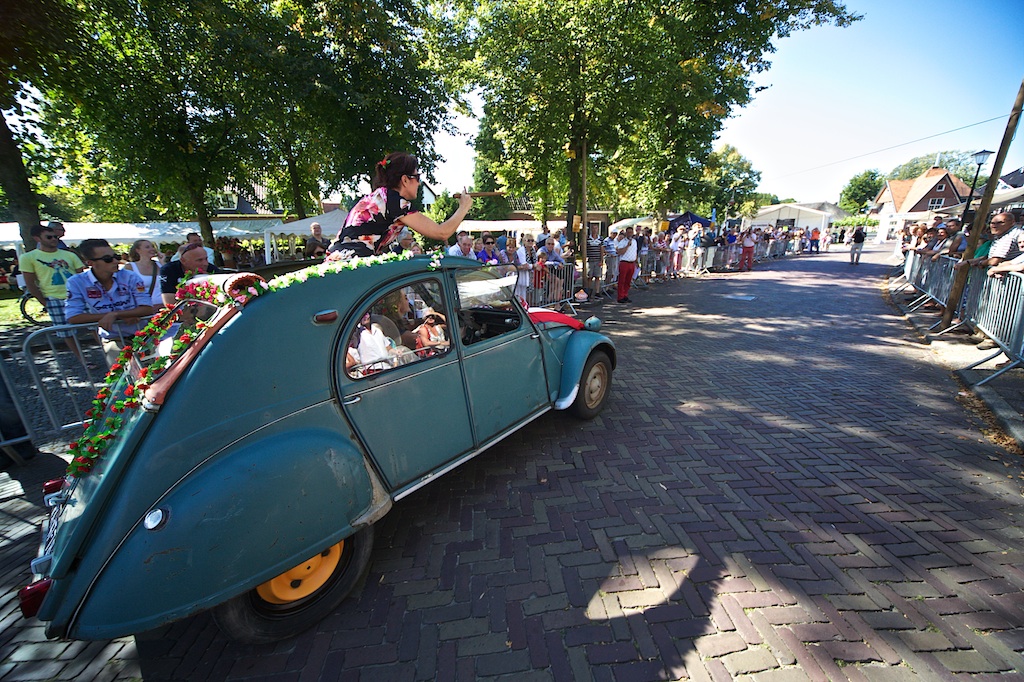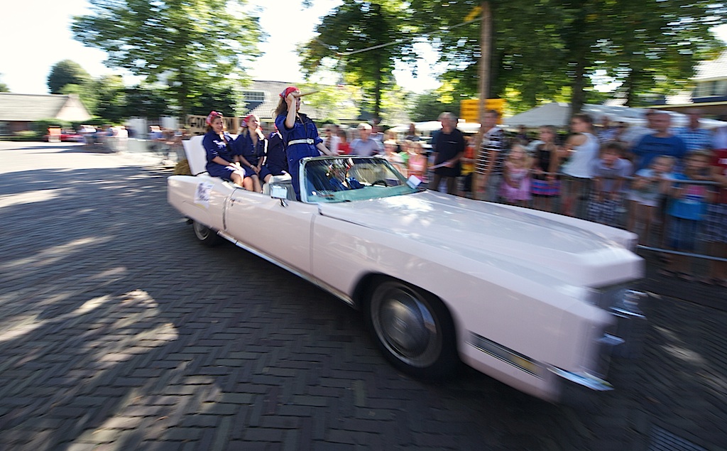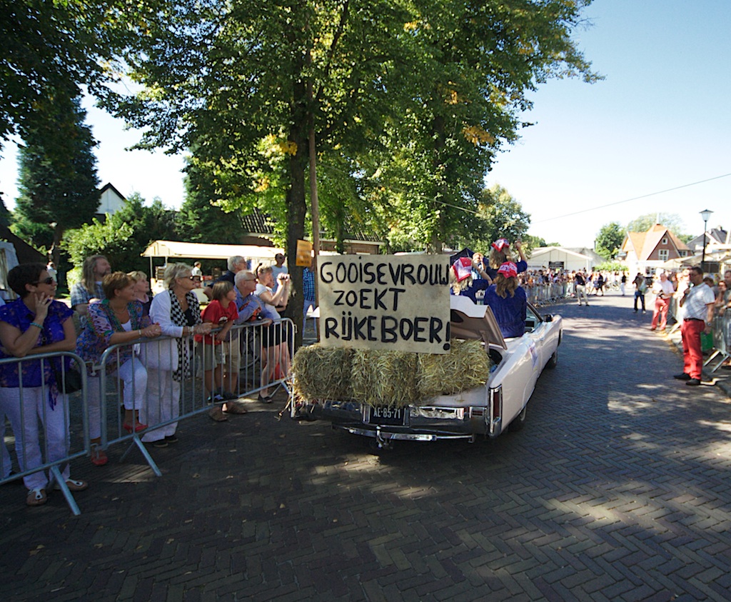 Het ringsteken voor dames in cabrio’s trok negen teams en is gewonnen door een zeskoppig rijke-boer-zoek-team uit Eemnes in een zevenpersoonsbed op wielen.