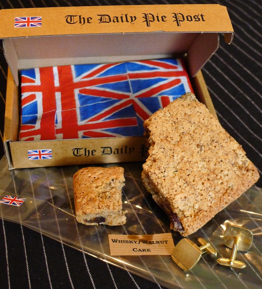 Dat laatste kan The Daily Pie Post (uit Blaricum) prima verzorgen. Deze home made Whisky Walnut Cake – qua bite and taste lekker mannelijk – wordt per post naar hem (of haar, of jezelf) toegestuurd. Aanrader.