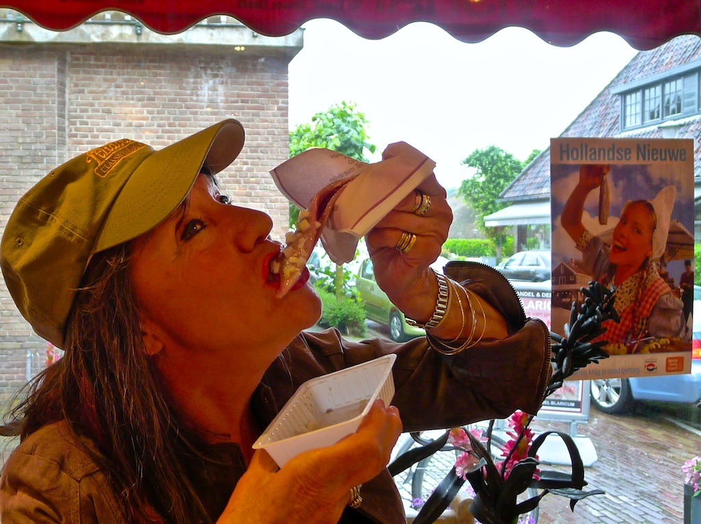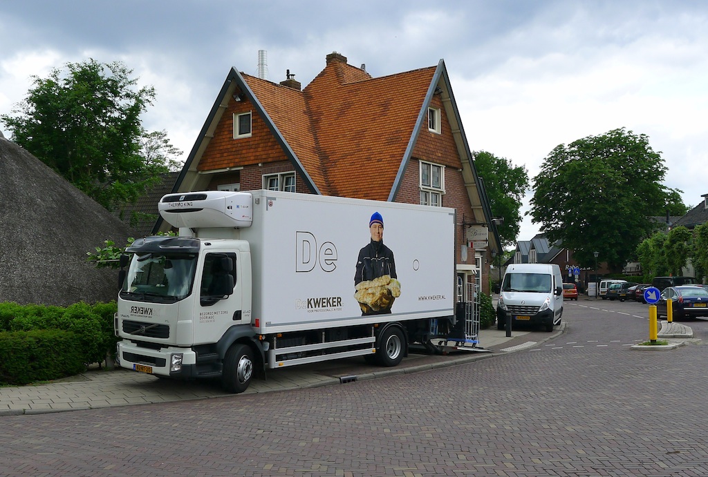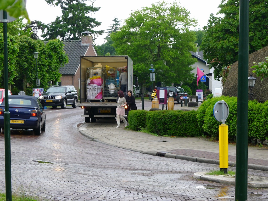 Onderstaande foto geeft enerzijds de dwaasheid ten top aan (politie rijdt soepel voorbij, terwijl bestelbus de gehele stoep blokkeert), en geeft anderzijds een oplossing aan: als de bloemenman van AH gedoogd voor de bank mag staan om te lossen, dan mag de sauzenleverancier van The Red Sun dat ook. Beter gezegd: moet dat ook. Hij heeft dan wel 15 meter meer heen en weer te lopen, tja …